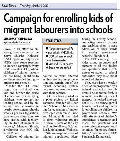 The ECC campaign has drawn up a systematic blue print for accomplishing this task for Pune by June, 2012. The campaign will however not end by merely enrolling the children in government schools but will go a step further in taking stock of children’s attendance, determining and assessing the problems and making relevant suggestions/ solutions for policy formulation and administrative handling, in short giving teeth to the legislation. Complete information regarding the campaign is available at :